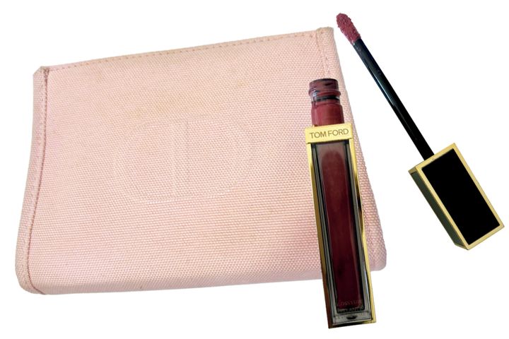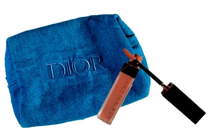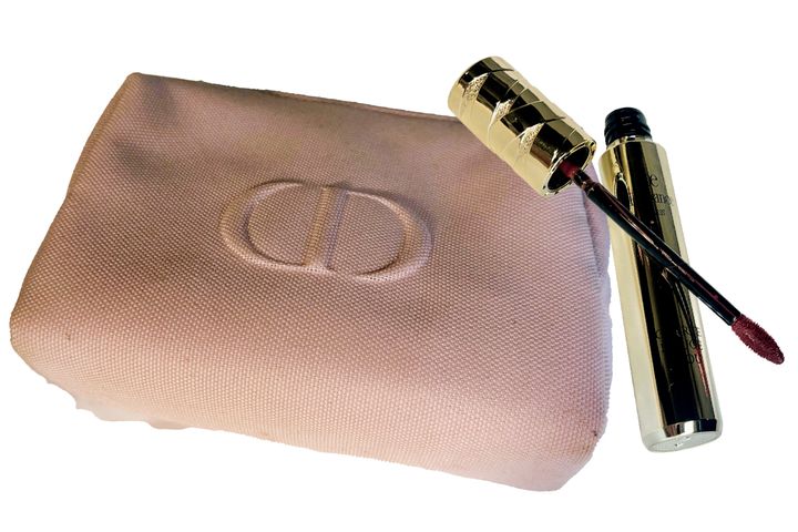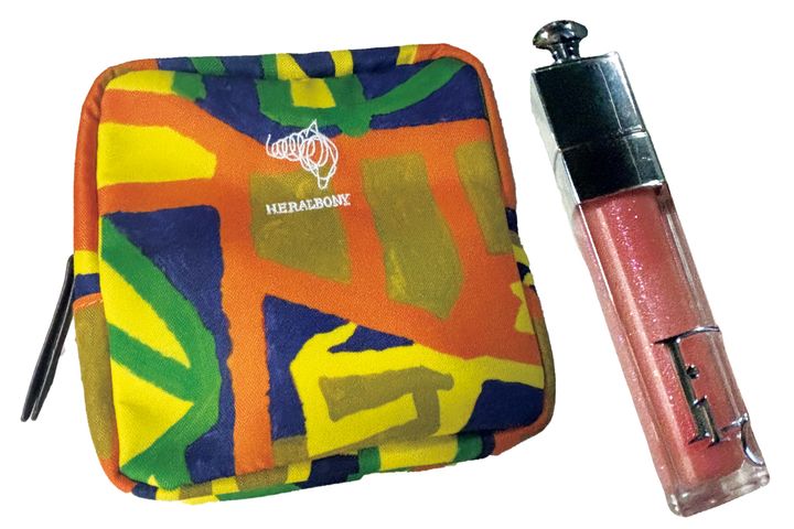 「イギリス行きJALビジネスクラスでいただいたポーチ。グロスはリップの上に中心のみ塗り、立体感を」(スミスさやかさん)ディオール アディクトリップマキシマイザー 010(ともに私物)