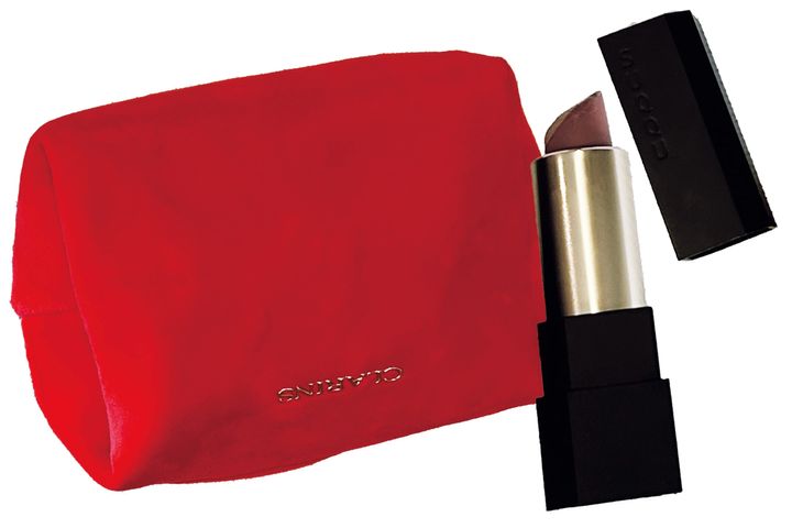「クラランスの限定ノベルティポーチ。ブルベの私の肌と相性のいい青みピンクのリップをヘビロテ中」(持田彩矢さん)シアーマット リップスティック03(ともに私物)