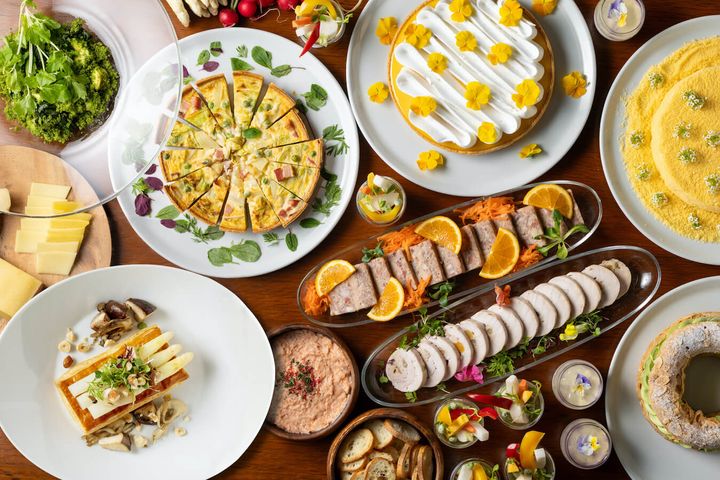 ブッフェテーブルには、春を彩る前菜とデザートがずらり