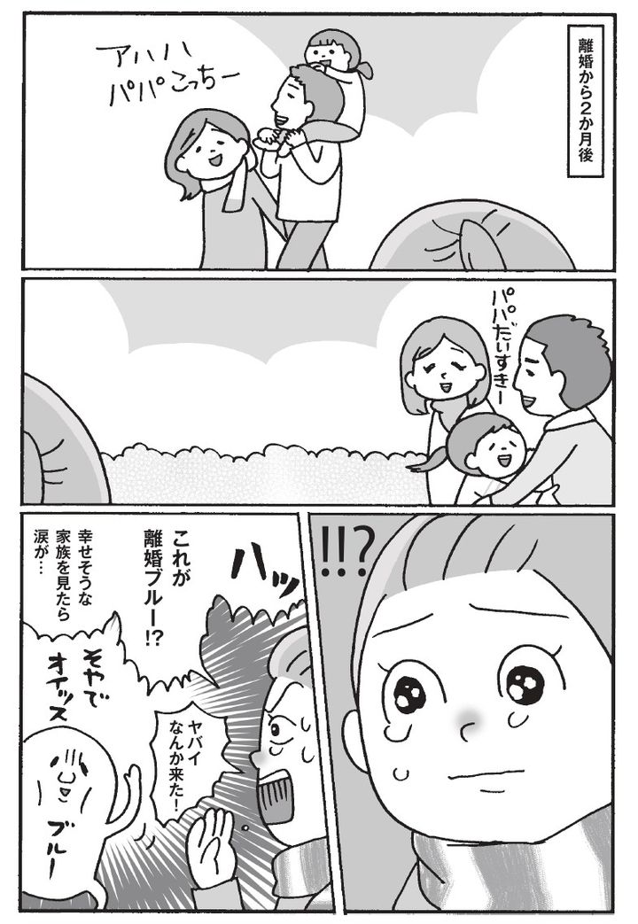 「パパとママは離れて暮らしたほうが仲良くなれる」と、離婚について前向きに子どもに伝えてきた主人公。しかし、離婚をしてからしばらくするとふいに後悔の気持ちが襲います。