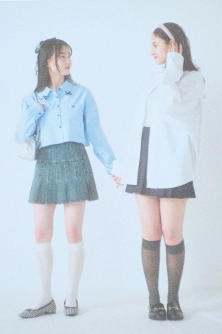 〈右・金川紗耶のコーデ〉白ビッグシャツ 9,999円/H&M Studio 2025年春夏コレクション(H&M)タンクトップ 2,490円/Isn't She? ネイビーミニスカート 10,450円/COCO DEAL(ココ ディール)カチューシャ 1,870円/アネモネ(サンポークリエイト)イヤリング7,350円/アビステ ビットつきローファー 2,640円/神戸レタス ソックス/スタイリスト私物〈左・三浦理奈のコーデ〉ブルーリボンポイントショートブラウス 4,399円/PHILLY デニムプリーツミニスカート 6,600円/RODEO CROWNS(バロックジャパンリミテッド)ヘアリボン3,300円/Mardi Mercredi(MARDI MERCREDI JAPAN)シルバーバッグ 2,749円/W♥C チェックフラットパンプス 7,590円/RANDA ソックス/スタイリスト私物
