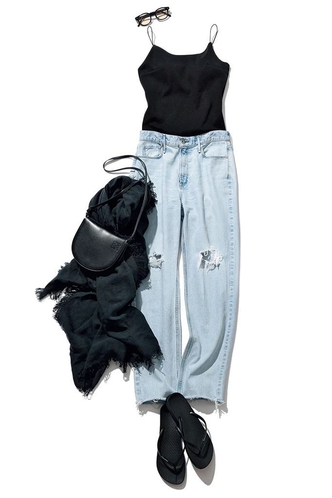 「ほどよくクラッシュした薄色デニムのラフなクールさを引き出すため、デニム以外を黒で統一。キャミソールとビーチサンダルで開放的な雰囲気を出しつつ、レザーバッグと冷房対策に大判黒ストールは欠かさない」(スタイリスト・船戸唯さん)