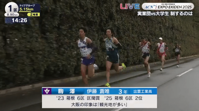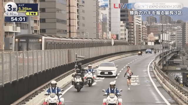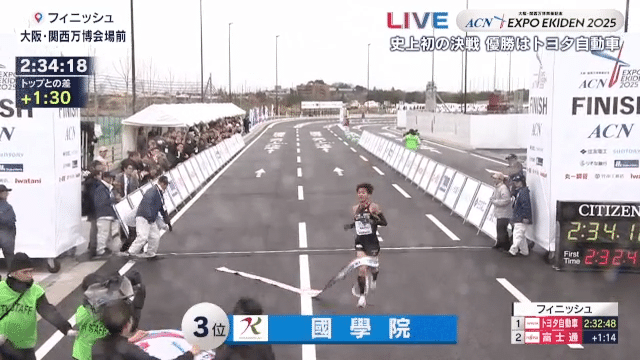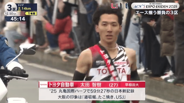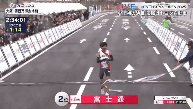 史上初めて大学生と実業団のトップクラスが駅伝で激突する「大阪・関西万博開催記念 ACN EXPO EKIDEN 2025」が2025年3月16日、大阪府・万博記念公園をスタート、夢洲(大阪・関西万博会場地)をフィニッシュとする7区間54.5kmで行われ、トヨタ自動車が2時間32分48秒で優勝した。