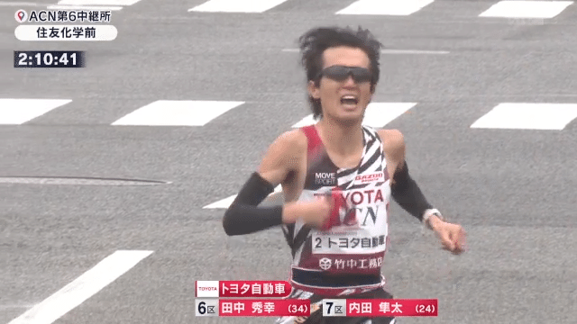 4区(5.4km)のサムエル・キバティ、5区(10.1km)・湯浅仁のルーキー2人もそれぞれ区間3位、4位と安定した走りで首位をがっちりキープする。6区(4.7km)の田中秀幸は出場全選手の中で最年長の34歳。ベテランらしく、しかし積極的な走りで区間賞を獲得し、2位に浮上してきた富士通との差を再び広げた。