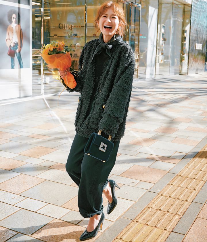 ジャケット¥39,600(アルページュストーリー)トップス¥17,600(HER.)パンツ¥42,900(エーゴールドイー/シチズンズ・オブ・ヒューマニティ)バッグ¥482,900(ロジェ ヴィヴィエ/ロジェ・ヴィヴィエ・ジャパン)パンプス¥137,500(ジャンヴィト ロッシ/ジャンヴィト ロッシ ジャパン)スカーフ¥15,400(バニティナップ/サードマガジン)ピアス¥13,200(ダブルスタンダードクロージング/フィルム)