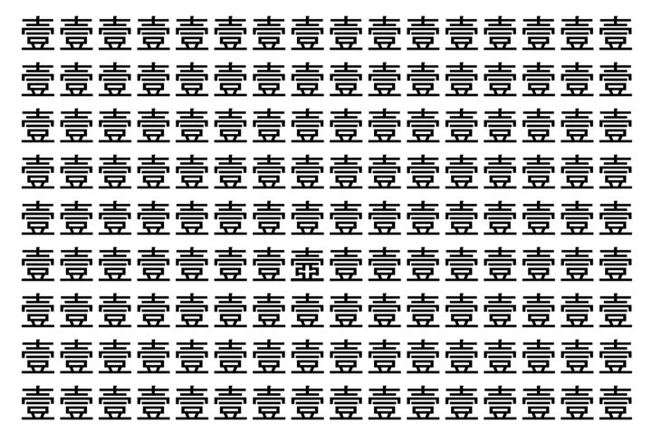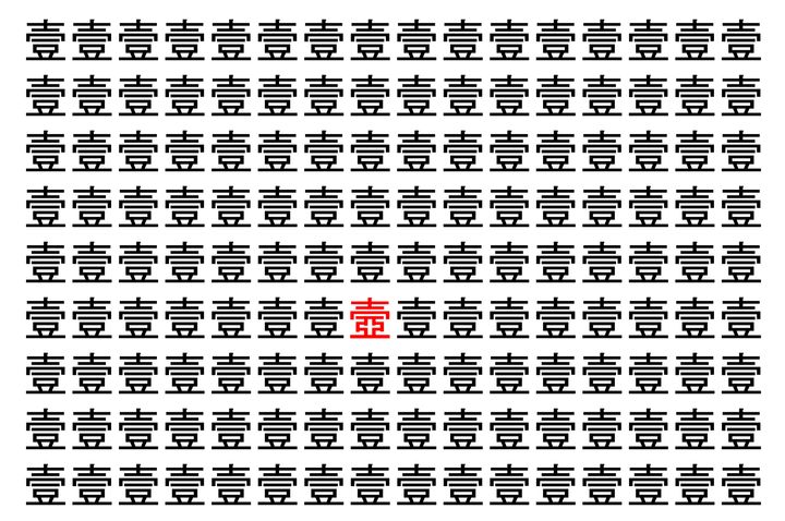 画像の中には、「壹」という漢字が縦に9行、横に16個並んでいます。 全部で144個となりますが・・・、そのうち1つは「異なる漢字」となってますよ!!