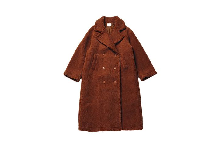 ブラウンのボアコートは長め丈。小柄な人ならあえての〝着られてる感〞も出て、さらに