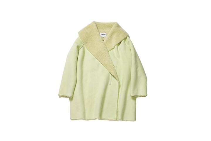 大きい襟と異素材MIXでメリハリUP。ペールグリーン色が、暗くなりがちな冬のコーデをパッと華やかに。
