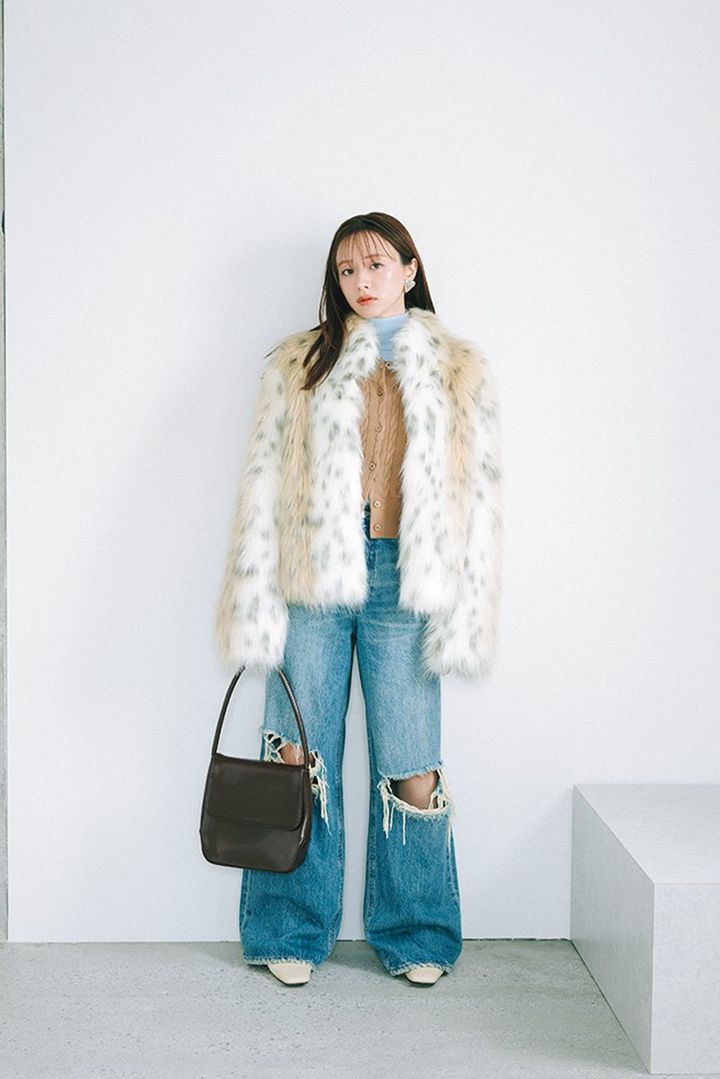 毛足長めのアニマル柄ファーコートは、それだけでゴージャスマダム感が出やすいので、ダメージデニムでラフに落とし込みつつ、品行方正感のあるベージュのニットカーデ×ペールブルータートルで爽やかに。