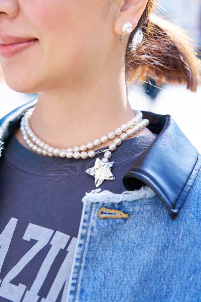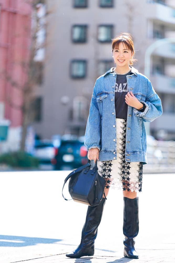 星の刺繍が目を引く女子ウケ抜群の褒められスカートを主役に、オーバーサイズのデニムジャケットで程よくカジュアルダウンしてこなれ感をプラス。デニムジャケットの襟、ブーツ、バッグを黒レザーで統一することでシックに大人のクラス感を纏えます。首元のパールのネックレスにスカートと同じ星を忍ばせているのが私的推しポイント!