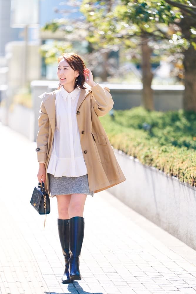 生足でミニスカートはやはり勇気がいりますが、定番の黒のロングブーツを合わせると肌見せのハードルが若干低くなるので、私のように抵抗感がある方でも挑戦しやすいのかなと思います。ブーツ合わせでも冬っぽさが出ないよう、程よい光沢とハリがあるベージュの中綿ライナー付きスプリングコートを羽織りました。襟のパールとピアスのパールをリンクさせれば顔周りも一段と華やかに。小物をブラックで引き締めて、上品甘辛カジュアルを意識しました。