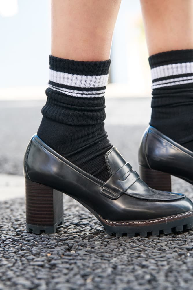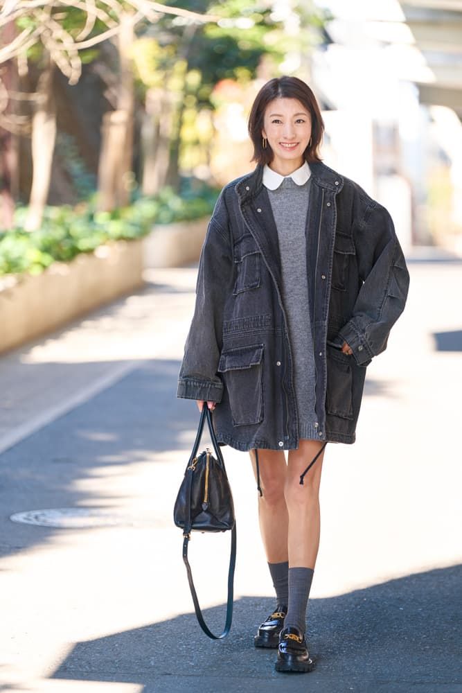 グレー×黒でシックにまとめた大人のミニスカコーデ。ミニ丈のニットワンピとアウターの丈を合わせることで今っぽいシルエットを意識しました。アウターをオーバーサイズにすると細見え効果を期待できそう!ミニでも子どもっぽくならないようにローファーには薄手のリブソックスを合わせてキレイめに寄せることで好バランスをキープ。