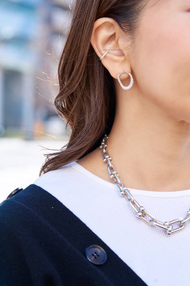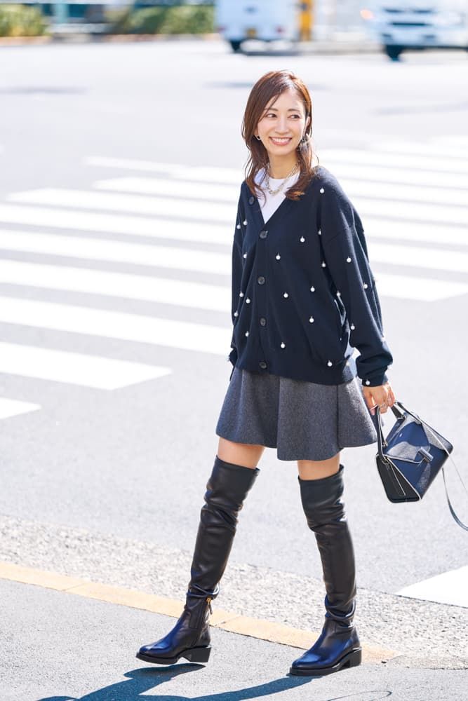 ミニスカート×パール付きカーディガンが甘い印象なのでカラーを「ほぼクロ」に抑えてシックに。春先はミニスカートにニーハイブーツを合わせると、肌の露出を抑えるだけでなくおしゃれ見え&寒さ対策としても効果あり。ヒールがないタイプを選べばカジュアルな印象に。アクセサリーをシルバーで統一することで、甘さを抑えて辛口な印象に仕上げました。