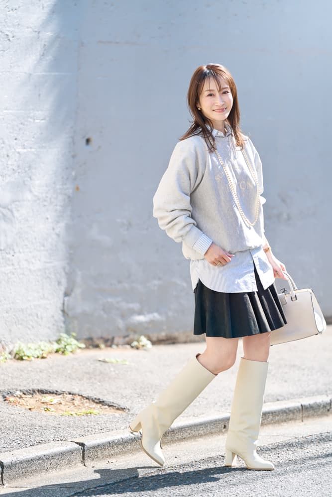 ミニスカートにはあえてカジュアルアイテムを合わせて、甘くなりすぎないようにバランスを取ります。今回はスウェットにシャツをINして「スポ可愛」に寄せてみました。一方で、バッグとブーツをホワイトレザーで統一してカジュアルすぎない大人の洗練感を意識。小物を黒から白に変えるだけで春らしく軽やかな印象になれます。
