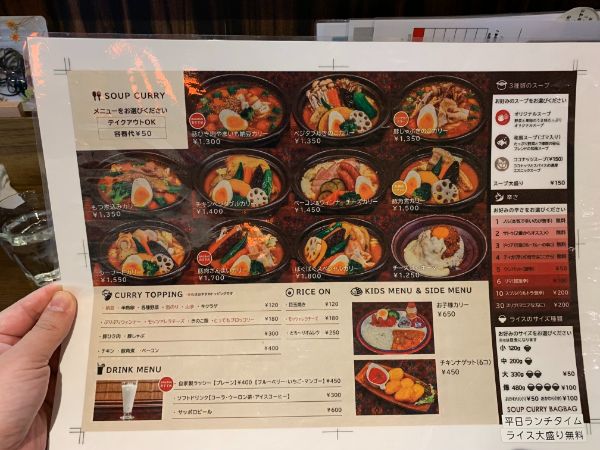 こちらのお店では好きなカレーメニューを選んだ後に、好みのスープの種類、辛さ、ライスの量を決めるという流れでした。 カレーのメニューは11種類あり、そのうちスープカリーは10種類のようです。どれも美味しそうです!!