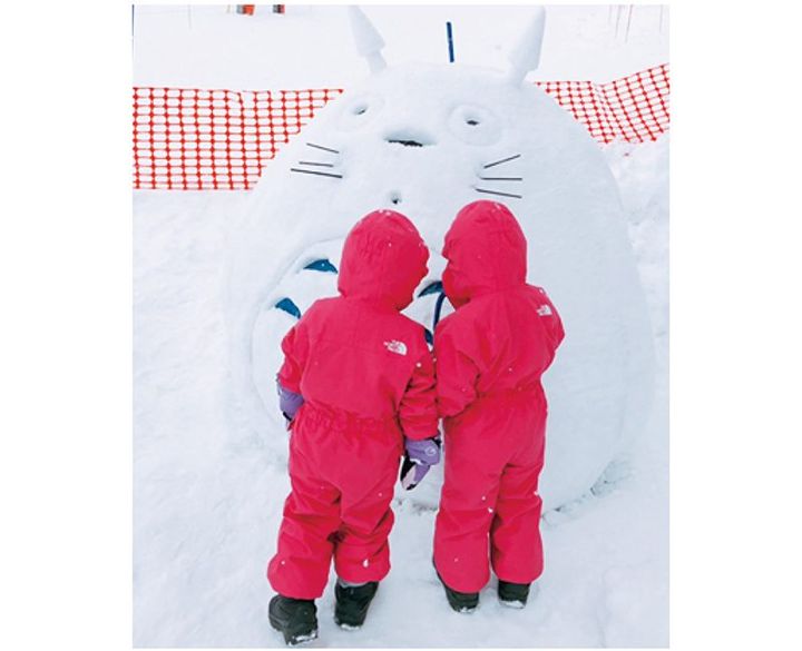 「ここ数年、双子は見つけやすいようにカラフルなウェアですが、長女と私は白ウェア。ザ・ノース・フェイスの防寒力はさすが!」真っ白の雪山に白いウェアが可愛いです。