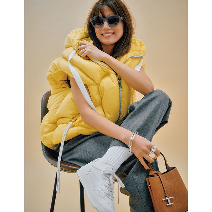「従兄弟家族と大所帯でニセコのコンドミニアムに滞在したことはありますが、いつかパーク ハイアットに泊まってみたいという願いを込めて」。亜希ちゃんの妄想&憧れが膨らむコーデも公開。ダウンベストはクリスジョイ、スニーカーはオートリー、オールインワンはロエフ、バッグはトッズのもの。