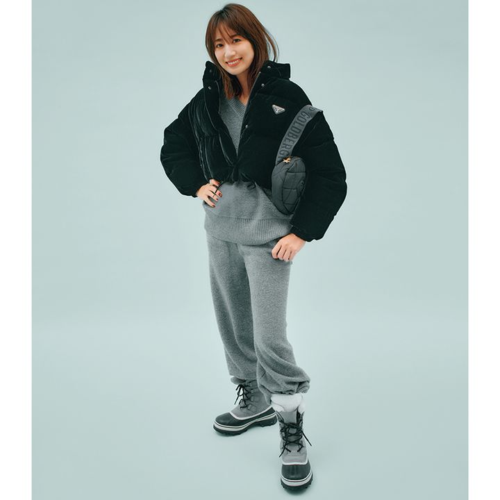旅行のときは、飛行機や車で長時間座っていても快適なニットアップが活躍。そこに、今っぽいクロップド丈とベロアの素材感にひと目惚れしたというプラダのベロアダウンを。ニットとパンツはアドーア、ダウンはプラダ、スノーブーツはソレル、バッグはゴールドバーグのもの。