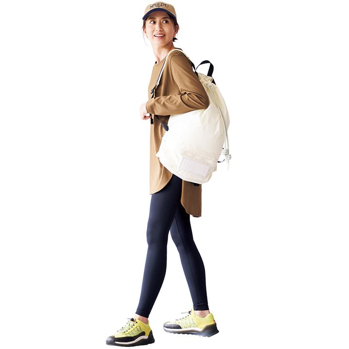 「突然パパが決めるハイキングはレギンスで軽快なコーデにするのが鉄則です」という亜希ちゃん。アウトドアシーンでレギンスを穿くなら、長めトップスでお尻まわりをカバーするのがベスト。トップスはエイトン、レギンスはウォルフォード、リュックとスニーカーはハンター、キャップはスーアンドヴェンのもの。