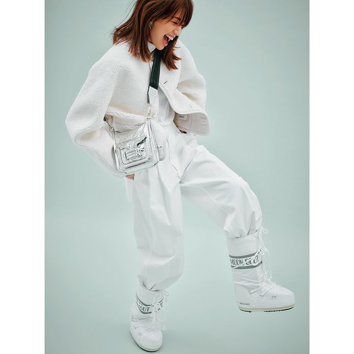 好きなブランドの白アイテムで作るオール白コーデにも憧れるそう。 子どもたちが成長した今「ずっとやってみたかった白コーデをそろそろ解禁できそうで楽しみです。」ボアジャケット、タートルニット、パンツはすべてロエフ、バッグはピエール アルディ、ブーツはムーンブーツのもの。