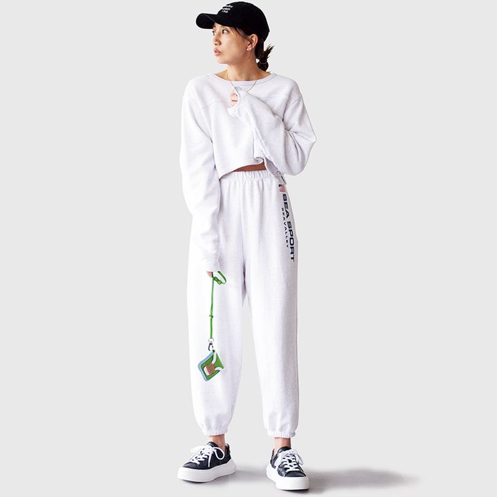 キャンピングカーでの旅行も亜希ちゃんファミリーの定番です。「遠出するときは、夜のうちから出発するので、パジャマも宿題も持っていきます。移動中はらくちんスウェット。SAで降りることもあるから今っぽさは追求します」。着心地がよく、休憩で車外に出るときも気分が上がるコーデです。スウェット、パンツ、キャップはシー、スニーカーバッグはピエール アルディのもの。