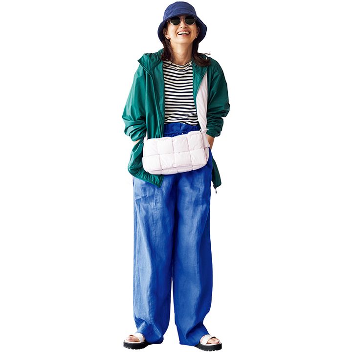 公園で着たいのは、ボーダーにカラフルアイテムを合わせたコーデ。カラーアイテムもグリーンとブルーなら、落ち着いた印象なのでモノトーン派にもおすすめ。シャカブルゾンは軽くて脱いでもかさばらないので重宝しそう。ブルゾンとハットはユニクロ、トップスはトゥモローランド、パンツはエブール、サンダルはザ ポーズ、バッグはボッテガ・ヴェネタのもの。