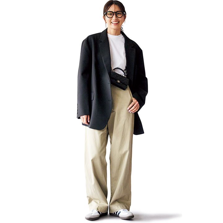 旅行がてら、家族で毎年お伊勢参りに行くという亜希ちゃん。参拝の際は長い距離を歩くので「歩きやすさ重視じゃないと無理なのはわかっているから足元はスニーカーがマスト。神聖な場所なので、自分なりにきちんとしたくてジャケットを持参」とのこと。ジャケットはザ フランキー ショップ、パンツはマディソンブルー、スニーカーはアディダス、バッグはシャネルのもの。