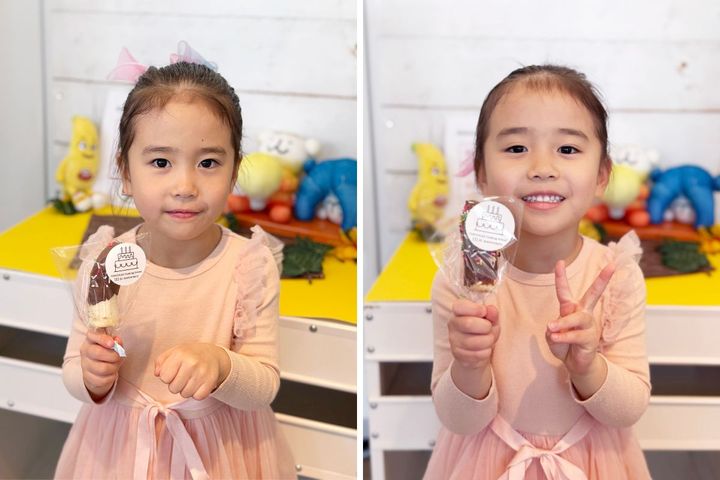 記念イベント前日から子どもたちが心待ちにしていたのが、チョコバナナ調理体験。大好きなスイーツが作れるとあってワクワクしながら会場に足を踏み入れると、そこで出迎えてくれたのはDoleバナナでお馴染みのキャラクター「スウィーティオ」。