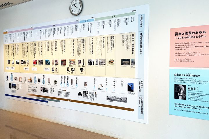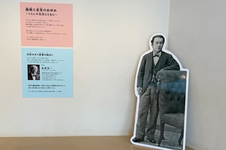 がすてーなでは、過去の貴重なガス製品も展示。日本でどのようにガスが広まっていったのかがわかる年表も興味深い。東京ガス創設者「渋沢栄一」のパネルやマンガもあり、大人も子どもも楽しめるスペースに