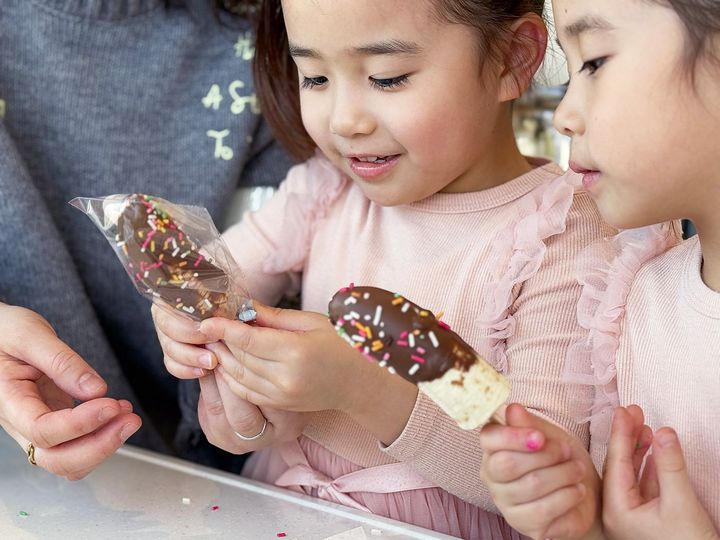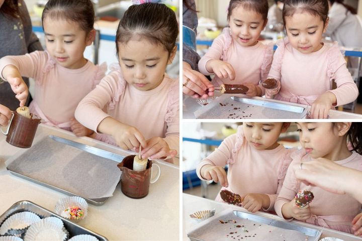 調理はカップに入った溶かしたチョコレートにもったいないバナナを回し入れて付け、固まらないうちに好みのチョコスプレーやアーモンドダイスを振りかけるという簡単なもの。
