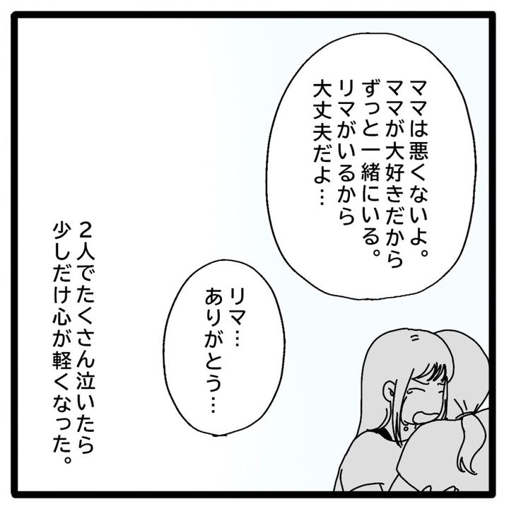 「ママは悪くないよ。ママが大好きだからずっと一緒にいる。リマがいるから大丈夫だよ・・・」とリマちゃんは言い2人はたくさん泣きました。