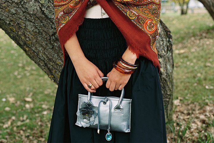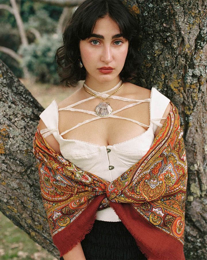 corset by YARA BARRAL, skirt by MAJE PARIS, shawl by DE COTÍO, necklace by KEMOSABE, bag by SARA PARADA, earrings and bracelets stylist’s own