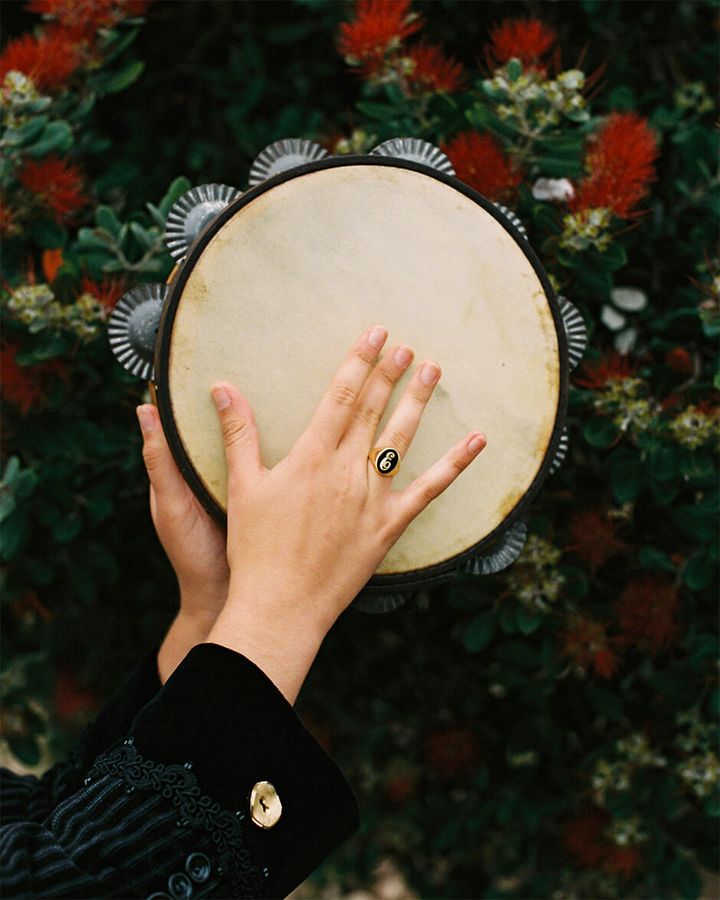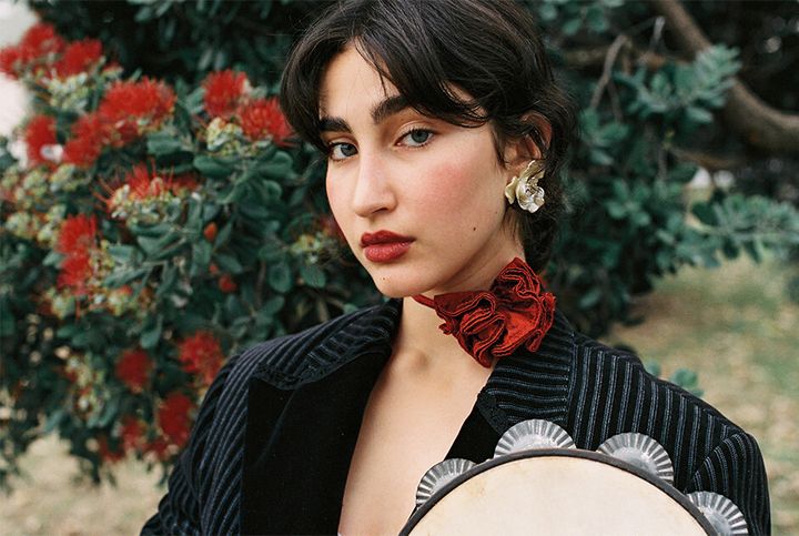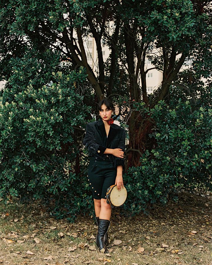 jacket by LAURA VILLAR, top and choker by SARA PARADA, trousers by DE COTÍO, earrings by KEMOSABE, vintage shoes stylist’s own, ring model’s own
