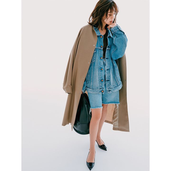 デニムジャケットにデニムハーフパンツは、ともすると子どもっぽい印象になってしまうので、小物合わせできれいめに。エレガントなコートを合わせて上品に仕上げます。コートはザ・リラクス、ジャケットはレッドカードトーキョー、パンツはアッパーハイツ、バッグはJ&M デヴィッドソン、靴はロジェ ヴィヴィエのもの。