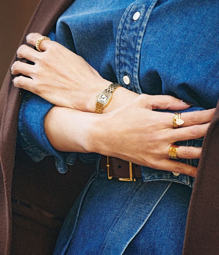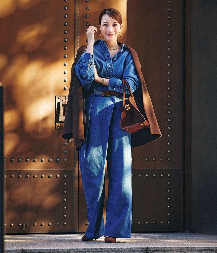 仕事を始める前の自分なら憧れていたけど絶対挑戦できなかったデニムオンデニム。自分に似合わせる髪型やメークを知ったので今のベストコーデが完成。カジュアルに着崩したデニムコーデには直線的な前髪やアップヘアに自立したカッコ良い風メークで女っぷりをプラス。今っぽいチョコブラウンコート、パンプス、ゴールドジュエリーで柔らかさとキレイめ要素を投入してコーデのバランスを調整しています。