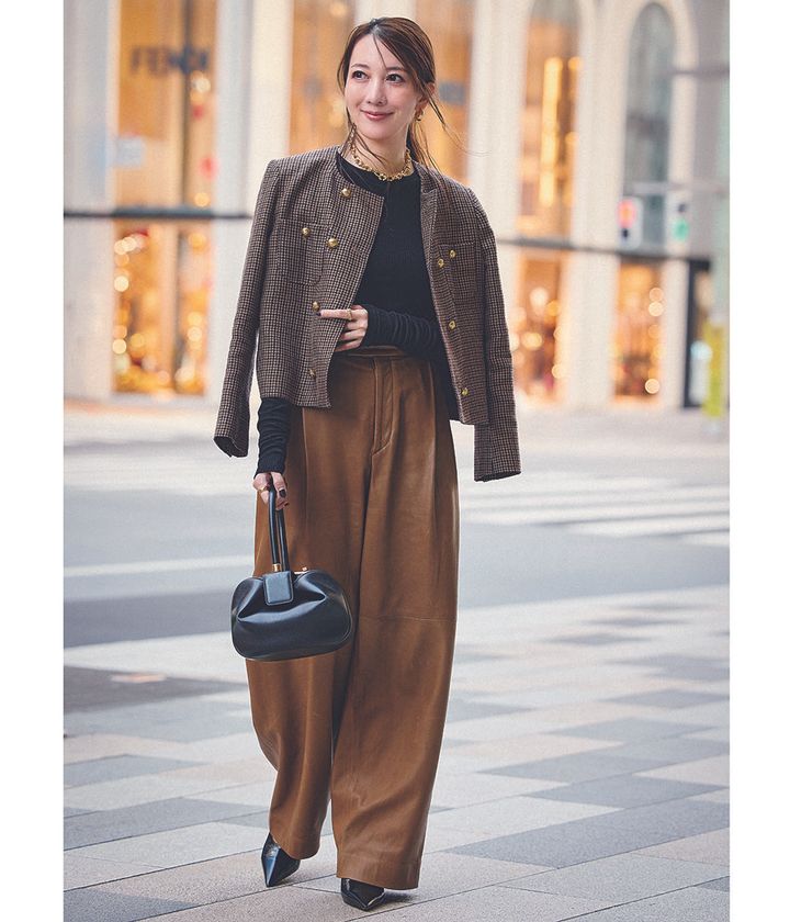 信頼感とトレンド、動きやすさの3点が仕事コーデのポイントです。仕事服はオシャレに見えて、説得力のあるカッコいいスタイルを意識。お気に入りのブラウンのレザーパンツがコーデを新鮮見えさせるキーアイテムです。