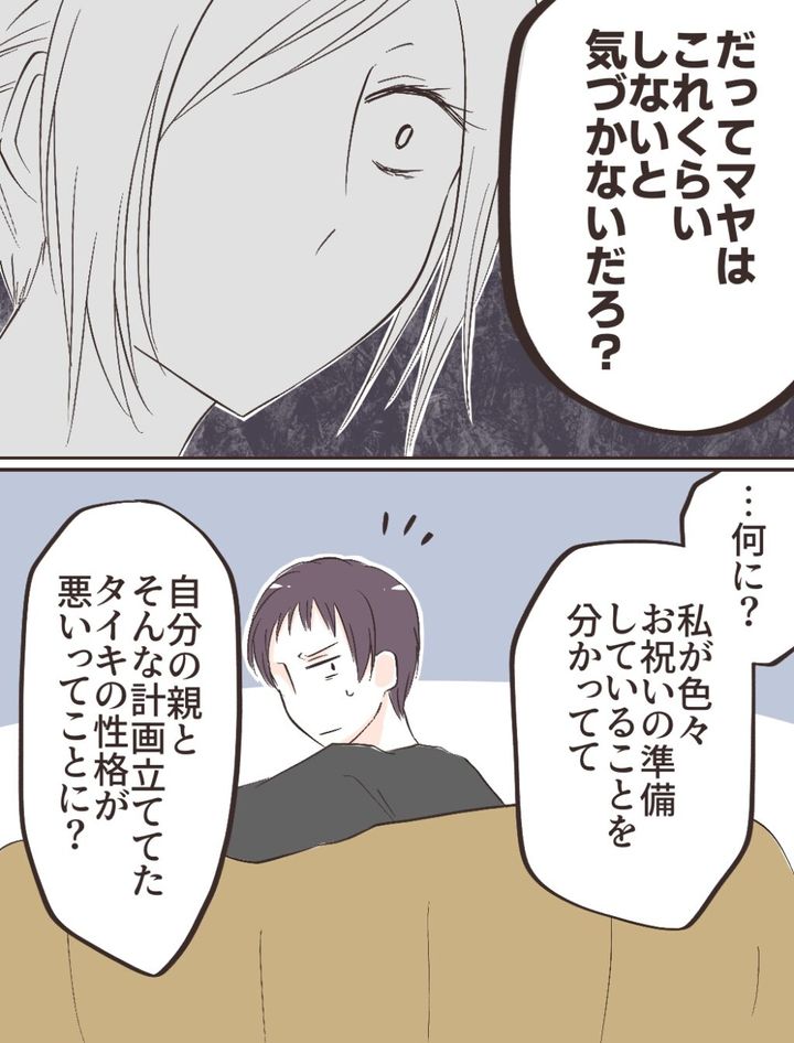 「・・何に?私が色々お祝いの準備していることを分かってて、自分の親とそんな計画立ててたタイキの性格が悪いってことに?」とマヤさんがたずねると、