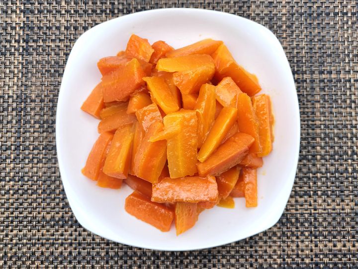 鍋の中で次第に煮詰まっていく様子を見ていると、こんなに簡単にできるんだなぁと思わず感心してしまいました。冷えてもおいしいはずですがせっかくなので出来立てを食べてみると、バターのコクと砂糖の甘みがにんじんにしっかりまとわりついていて、とてもおいしいグラッセが出来上がりました。バターに塩が含まれているので余計に甘みが引き出され、付け合わせなのにこれだけでもおかずになりそうです。料理を作るごとに仕込むのは大変ですが、冷蔵庫で4~5日は持つそうですので、こうして少しまとめて作っておいて副菜として食卓に出すと豪華になっていいですね。間違いなく、子どもも大人も好きな味です。