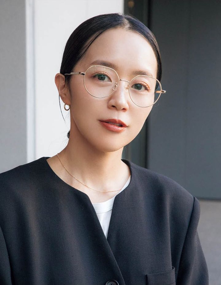 「大ぶりのフレームも華奢なゴールドメタルなら主張し過ぎず、アクセサリー感覚でかけられます。シックなブラックのジャケットも眼鏡をかけるだけで一気に華やぎます」(串田 翠さん)