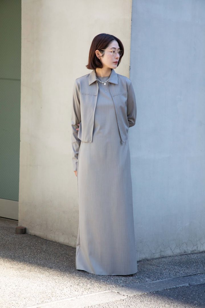 「眼鏡に合わせたスタイリングがこちらです。ガブリエラ コール ガーメンツの別注ドレスとジャケットの、キレイめなグレーの色みが女性らしいセットアップが今季のお気に入りです」(高橋 悠さん)