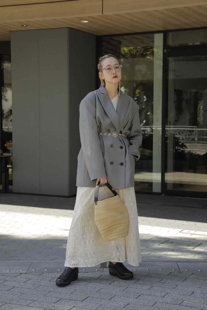 「ジャケットを羽織り、レースドレスをハンサムなムードになるようスタイリングしました。カチッとしすぎないように、今っぽいカジュアルさが出るクリアフレームのアイウエアや、カゴバッグをプラスしたこともポイントです」(波田桜子さん)