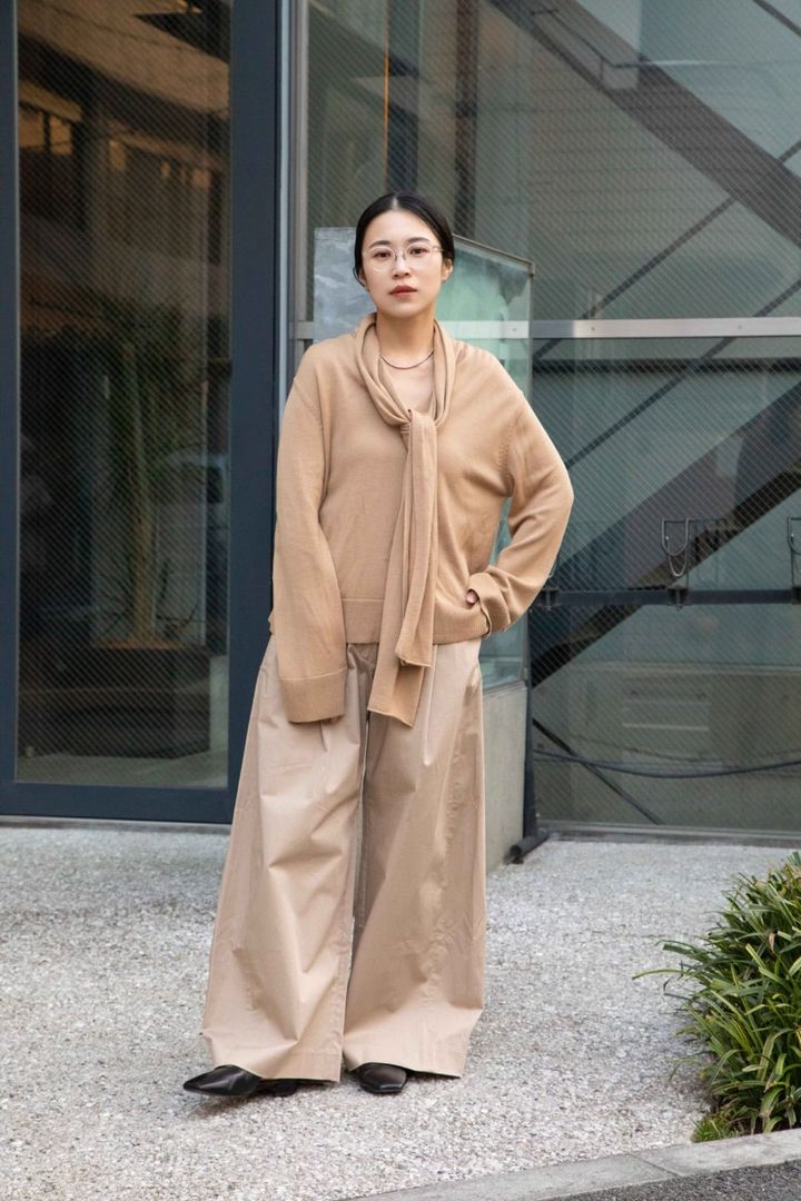 「ベージュのワンカラーコーデにまとめ、眼鏡もクリアなフレームを選ぶことでミニマルなスタイルに。フレームの透明感を生かしたかったので、アクセサリーは控えめにしたのもポイントです」(佐藤有華さん)