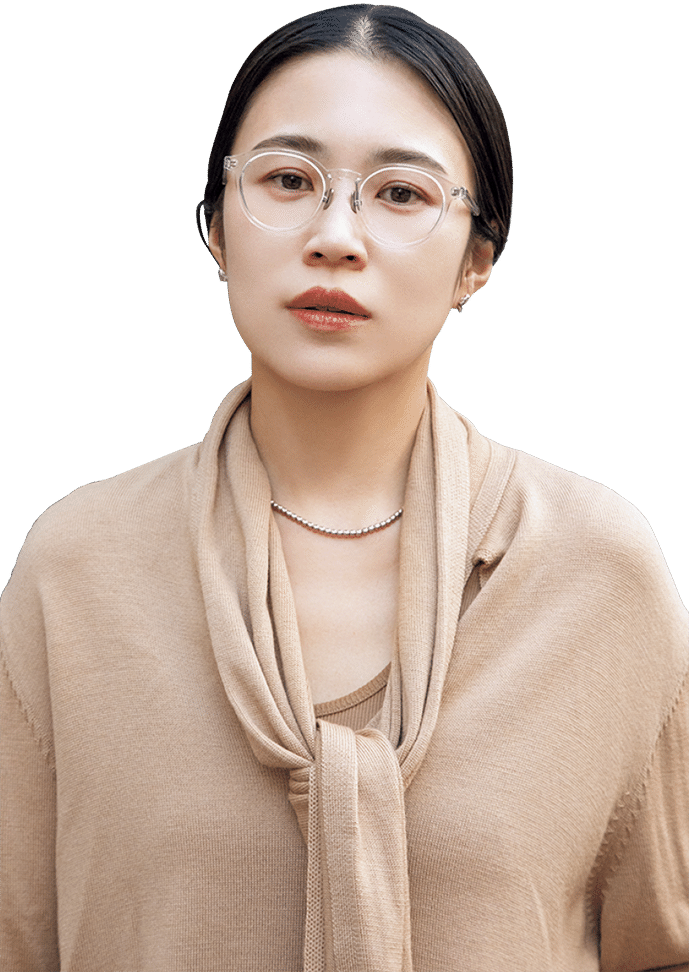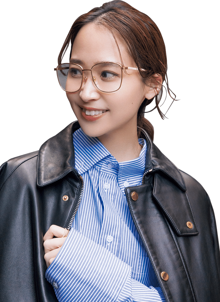 「クリアフレームはシンプルでありながらもスタイリッシュでさまざまなファッションにフィットし、使い勝手抜群。眼鏡の透明感を生かすため、ジュエリーもあえて控えめにしました」(佐藤有華さん)