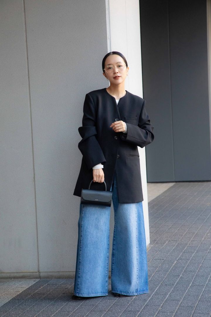 「シックなブラックのジャケットに、ボトムはお気に入りのバギーデニムを合わせてリラックス感のあるスタイリングに」(串田 翠さん)