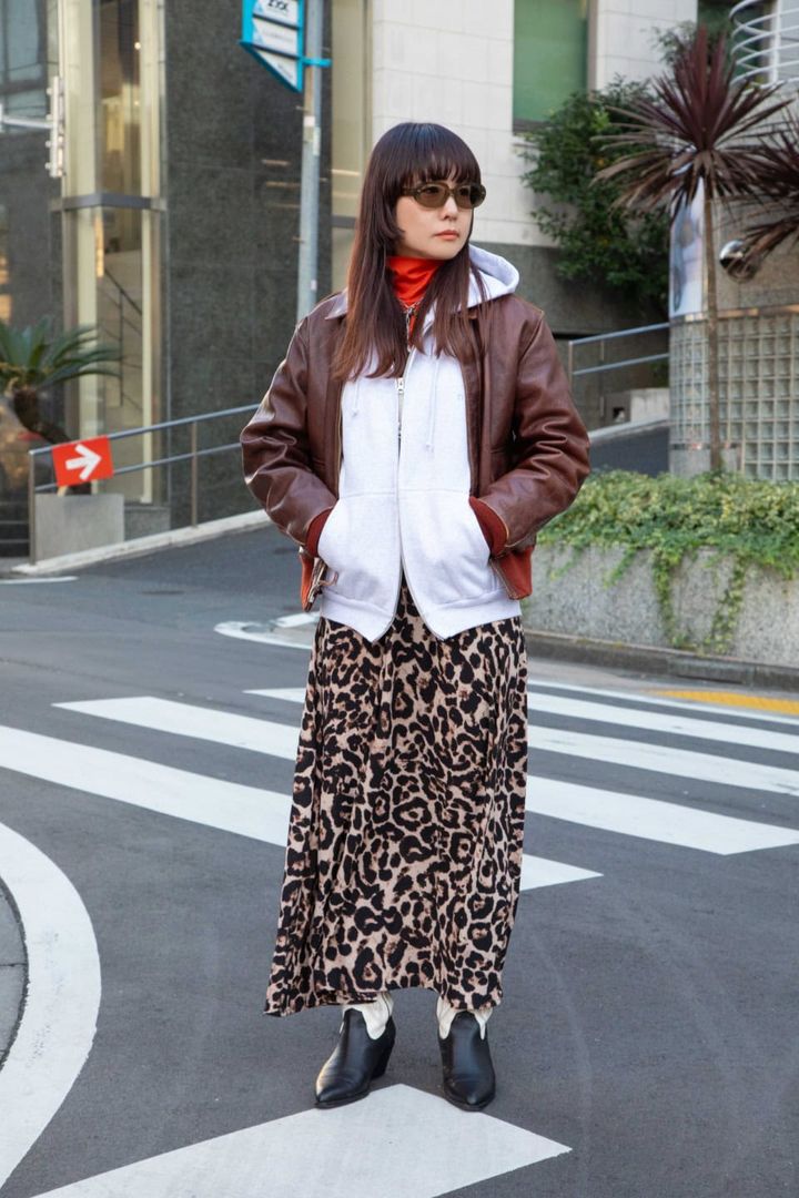 「スタイリングは、オーバーサイズのレザーブルゾンと、ミニスカートを合わせてカジュアルになりすぎないように全体のバランスを整えました。全体的にカラーはダークトーンで揃えていますが、地味にならないように、それぞれディテールが際立つアイテムをチョイスしています」(舘 かおりさん)