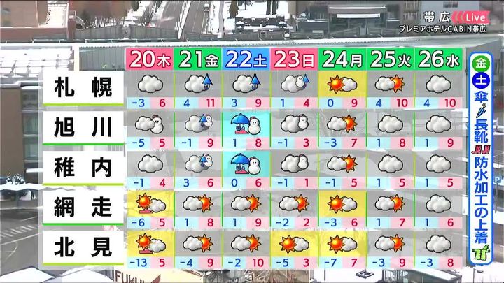 道北や道央で雪が降りますが、道東方面は晴れるでしょう。最低気温は19日朝より3度ほど高く、札幌は‐3度です。最高気温は19日より2度くらい高く、5度前後でしょう。