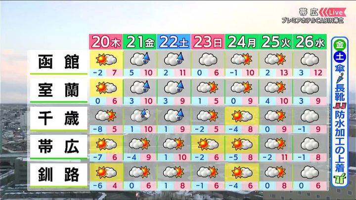 小樽や倶知安で昼頃まで湿った雪の降る時間があるため、傘があると安心です。札幌や江差、浦河は雲に覆われますが、函館や苫小牧は晴れるでしょう。