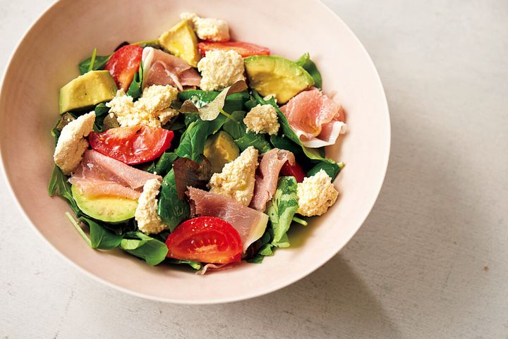 3.トマト、アボカド、生ハムは食べやすい大きさに切り、器にベビーリーフとともに盛り、2を散らして塩をふり、オリーブオイルをまわしかける。