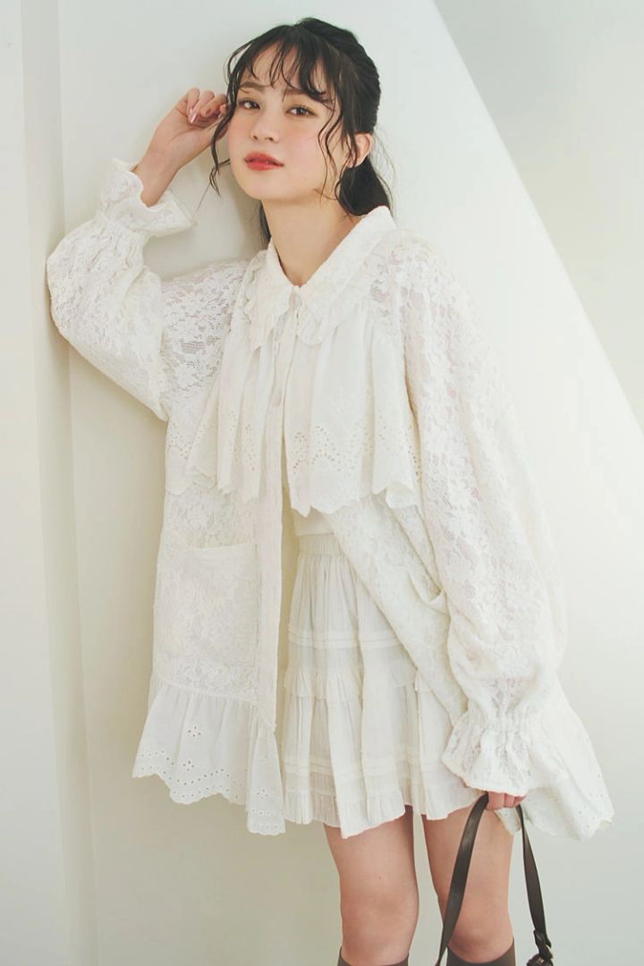 白レースジャケット 13,200円/merry jenny 白コットンレースミニスカート 3,299円/PHILLY ハイソックス 880円/靴下屋(Tabio)バッグ 19,970円/クリスティーンプロジェクト(HANA)
