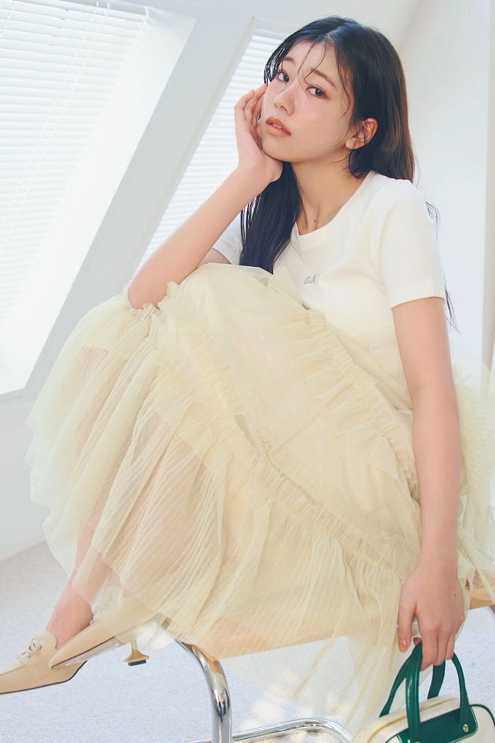 ティアードをはくならトップスはシンプルがマスト。オトナ顔は甘〜い盛りアイテムは1点にとどめるのがベター。他のアイテムは主張のないベーシックなものを選んで♡